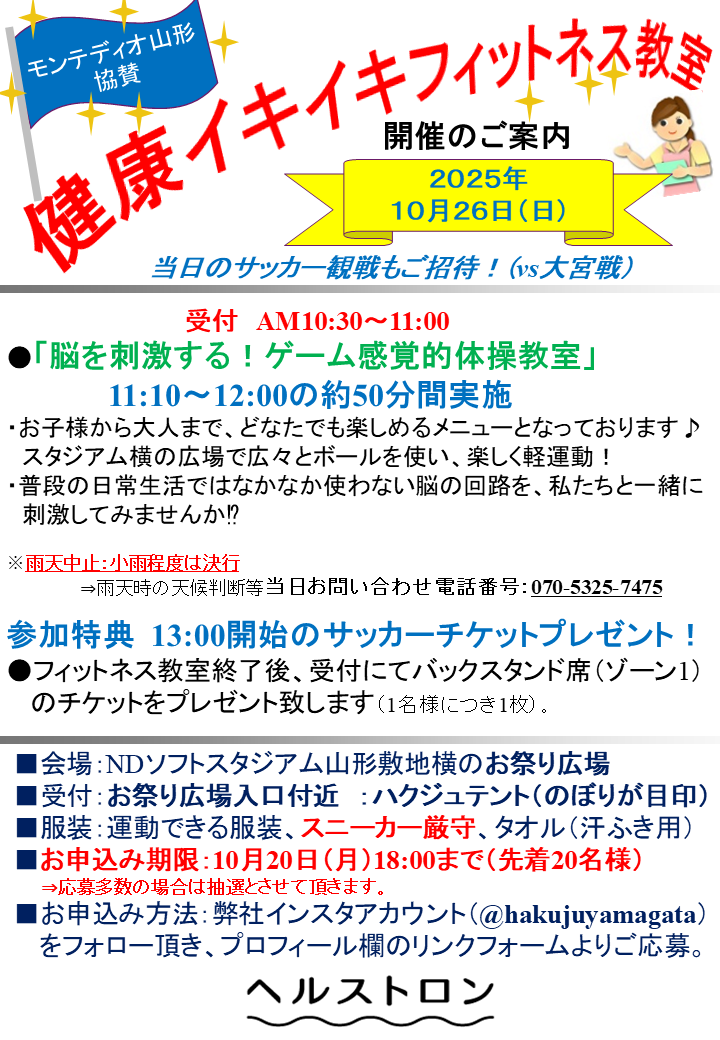 フィットネス教室終了後はモンテディオ山形の試合チケット(バックスタンド:ゾーン1)のチケットももらえるよ😉 Jリーグ観戦まで楽しんで、モンテディオ山形を応援しよう⚽